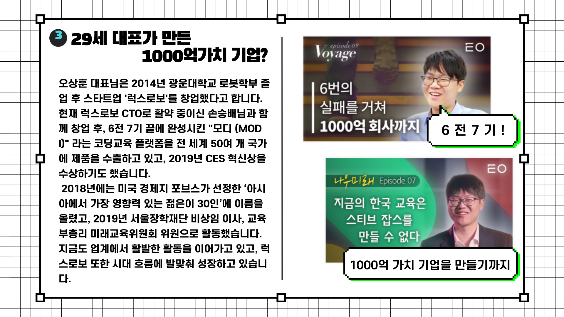 오상훈 대표님은 2014년 광운대학교 로봇학부 졸업 후 스타트업 '럭스로보'를 창업했다고 합니다.
