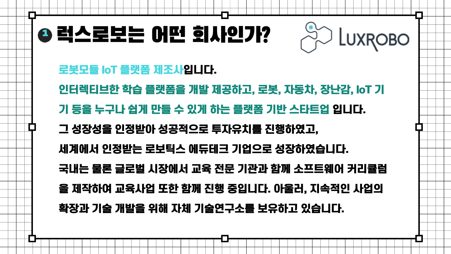 인터렉티브한 학습 플랫폼을 개발 제공하고, 로봇, 자동차, 장난감, IoT 기기 등을 누구나 쉽게 만들 수 있게 하는 플랫폼 기반 스타트업 입니다.