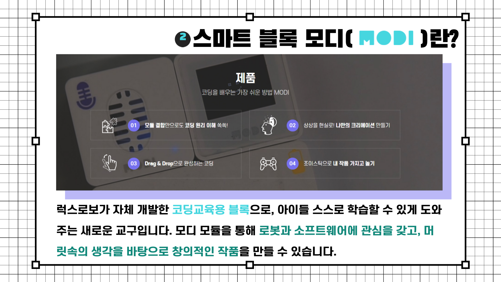 모디 모듈을 통해 로봇과 소프트웨어에 관심을 갖고, 머릿속의 생각을 바탕으로 창의적인 작품을 만들 수 있습니다.