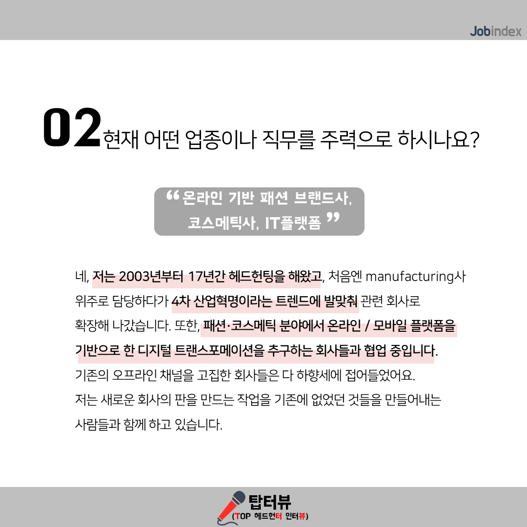 - 네, 저는 2003년부터 17년간 헤드헌팅을 해왔고, 처음엔 manufacturing사 위주로 담당하다가 4차 산업혁명이라는 트렌드에 발맞춰 관련 회사로 확장해 나갔습니다. 또한, 패션∙코스메틱 분야에서 온라인 / 모바일 플랫폼을 기반으로 한 디지털 트랜스포메이션을 추구하는 회사들과 협업 중입니다. 기존의 오프라인 채널을 고집한 회사들은 다 하향세에 접어들었어요. 저는 새로운 회사의 판을 만드는 작업을 기존에 없었던 것들을 만들어내는 사람들과 함께 하고 있습니다.