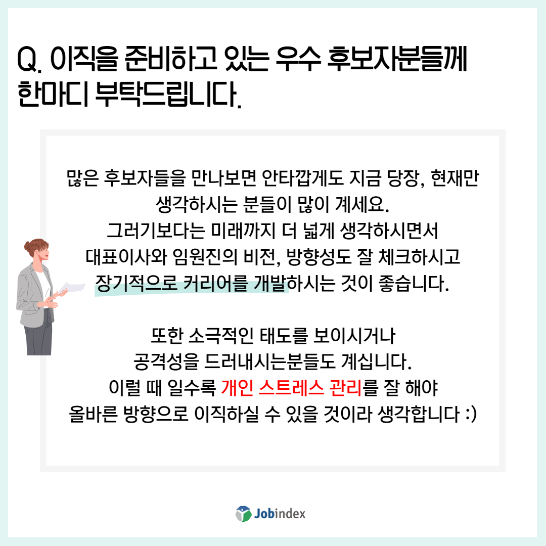 Q. 이직을 준비하고 있는 우수 후보자분들께 한마디 부탁드립니다.