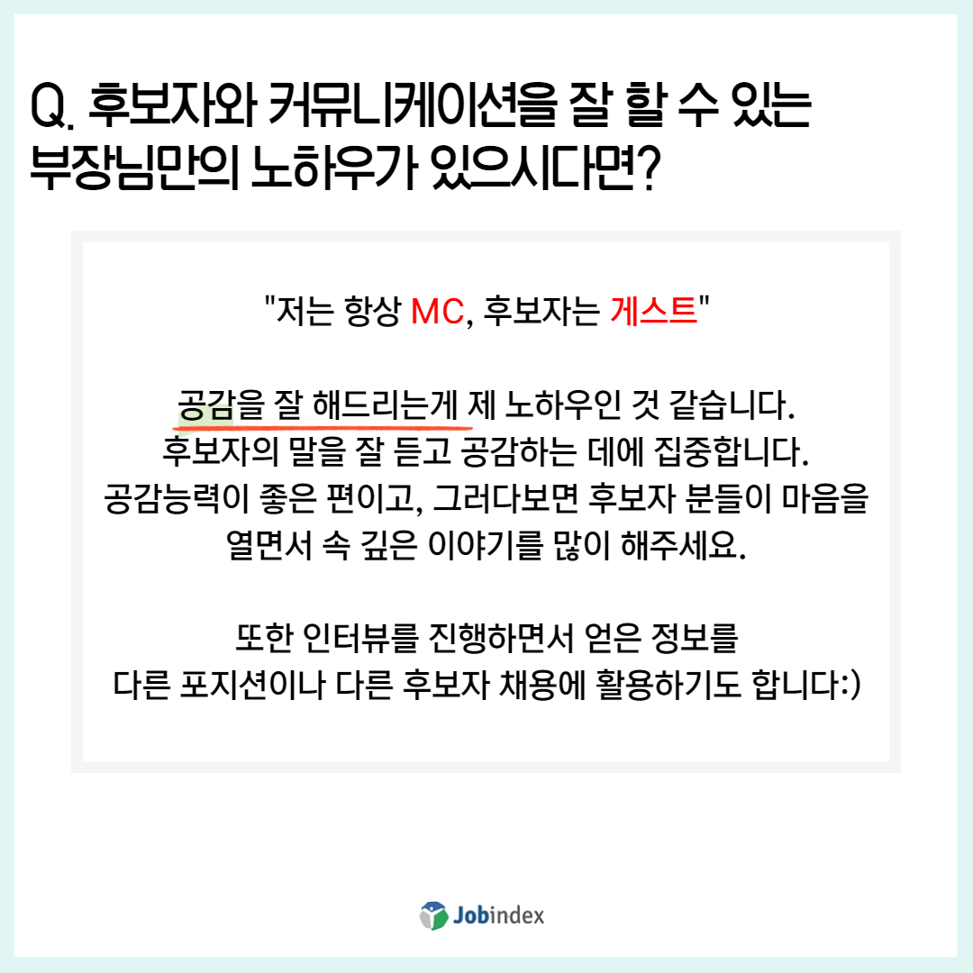 Q. 후보자와 커뮤니케이션을 잘 할 수 있는 부장님만의 노하우가 있으시다면?