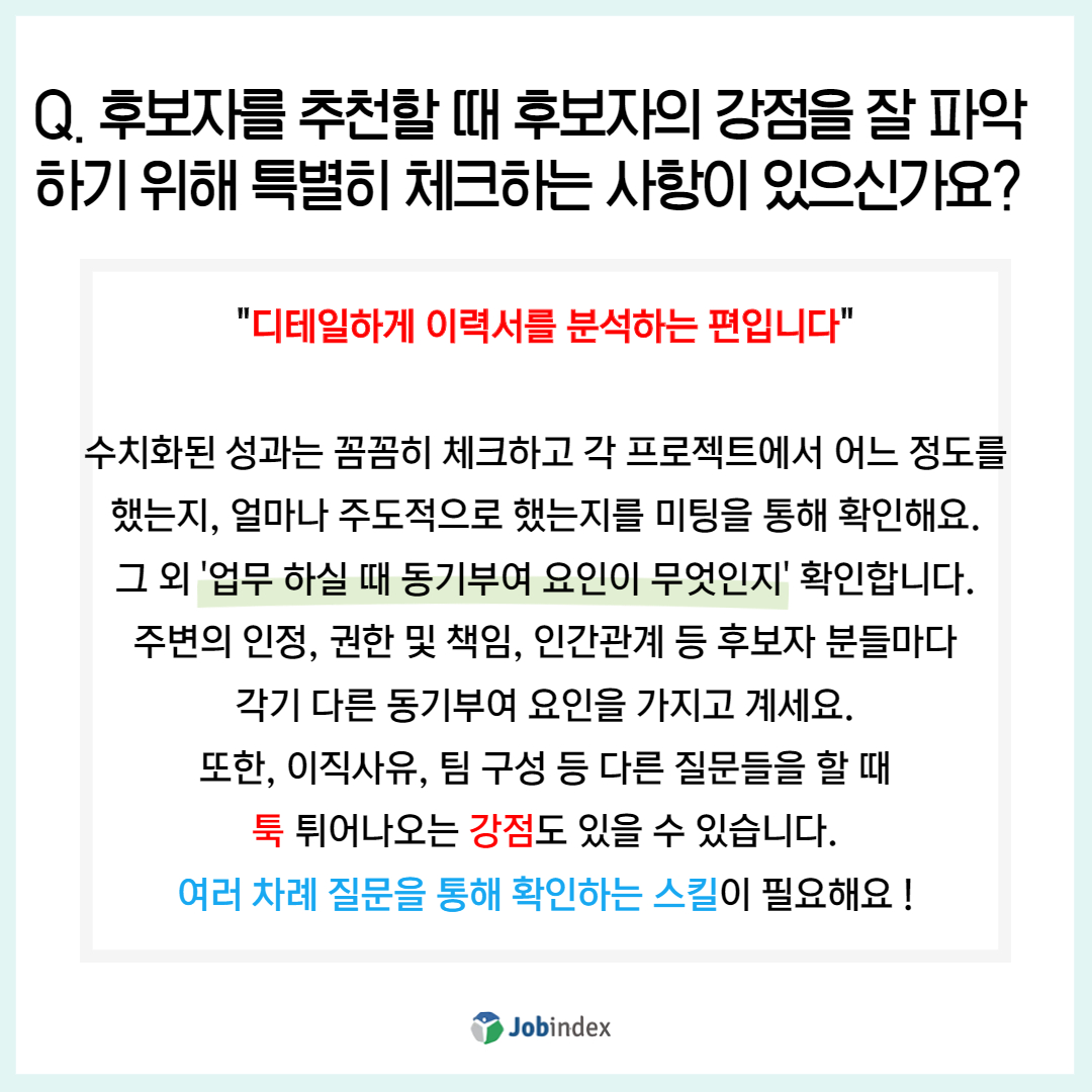 Q. 후보자를 추천할 때 후보자의 강점을 잘 파악하기 위해 특별히 체크하는 사항이 있으신가요?