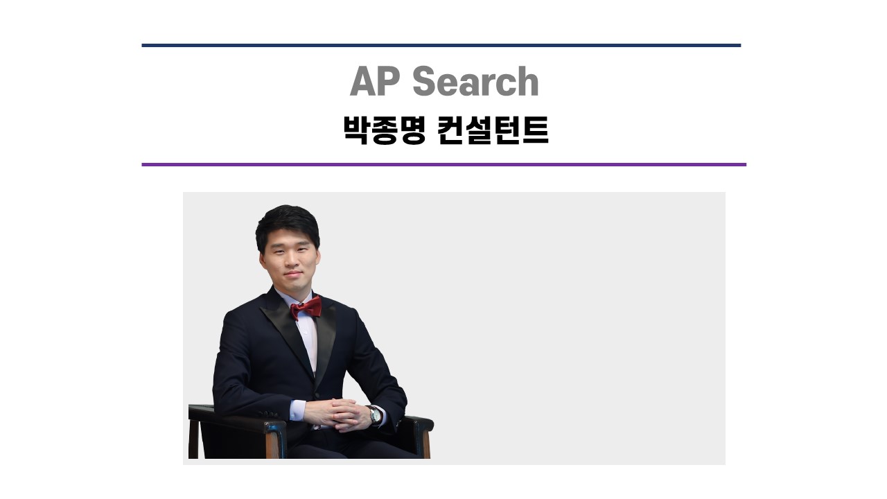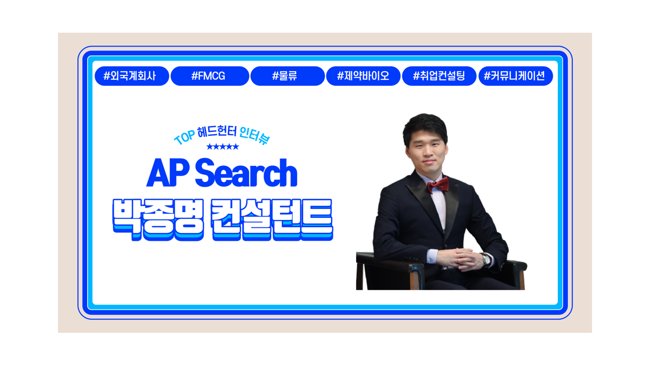 AP Search 박종명 팀장은 외국계 FMCG, 물류, 제약 바이오 분야의 전문성을 바탕으로 해당 분야 채용에서 다양한 성과를 쌓아왔다. 외국계 메이저 헬스케어 종합회사 출신으로, 외국계 기업 채용에 큰 강점을 가지고 있다.