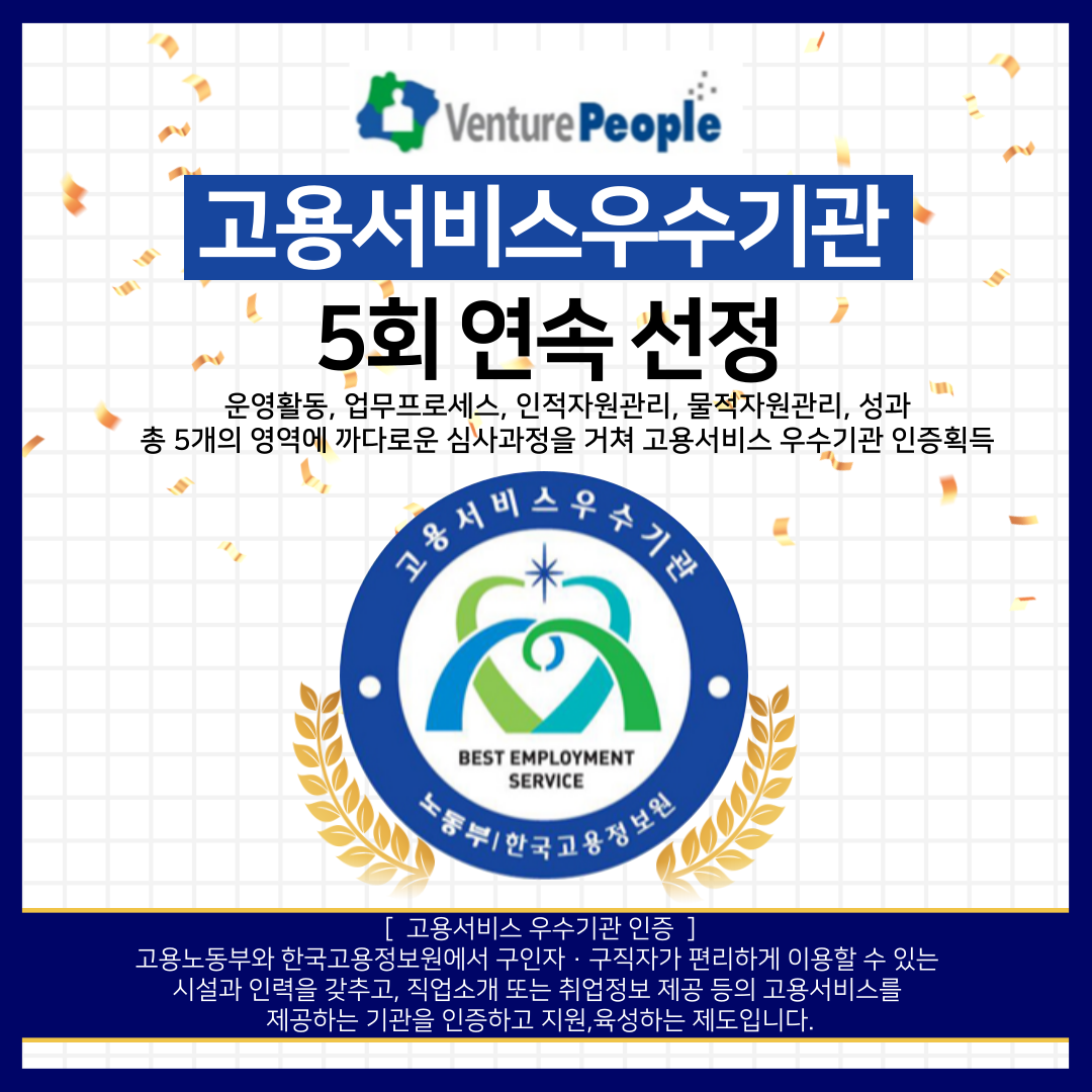 [ '벤처피플 Venture People' 고용서비스우수기관 5회연속선정 ]