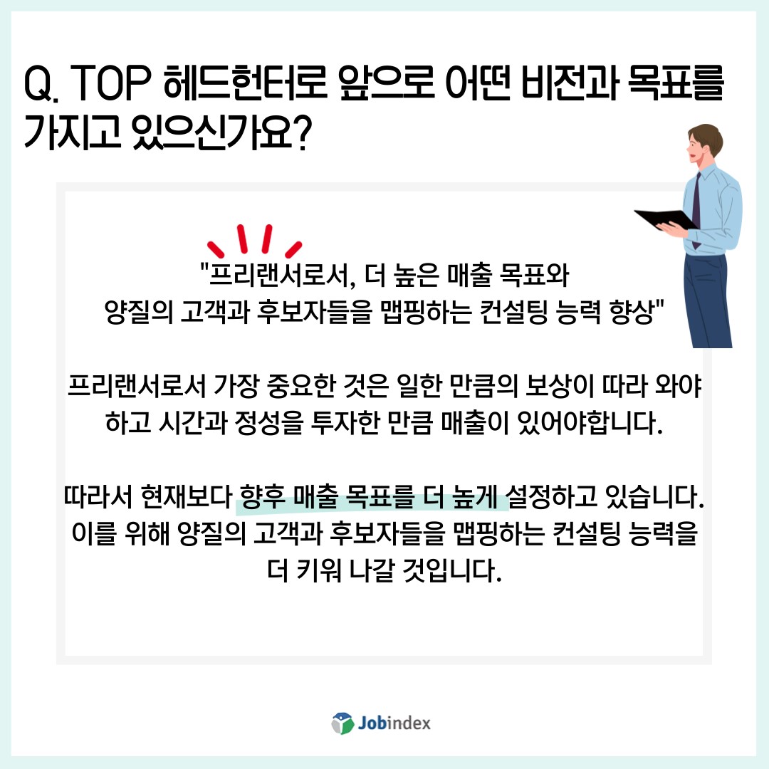 Q. TOP 헤드헌터로 앞으로 어떤 비전과 목표를 가지고 계신가요?