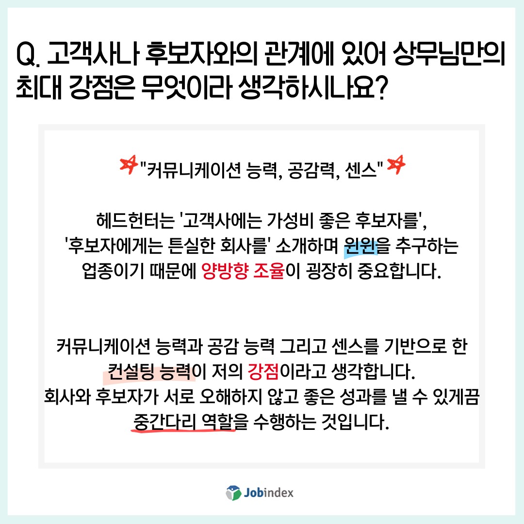 Q. 고객사나 후보자와의 관계에 있어 상무님만의 최대 강점은 무엇이라 생각하시나요?