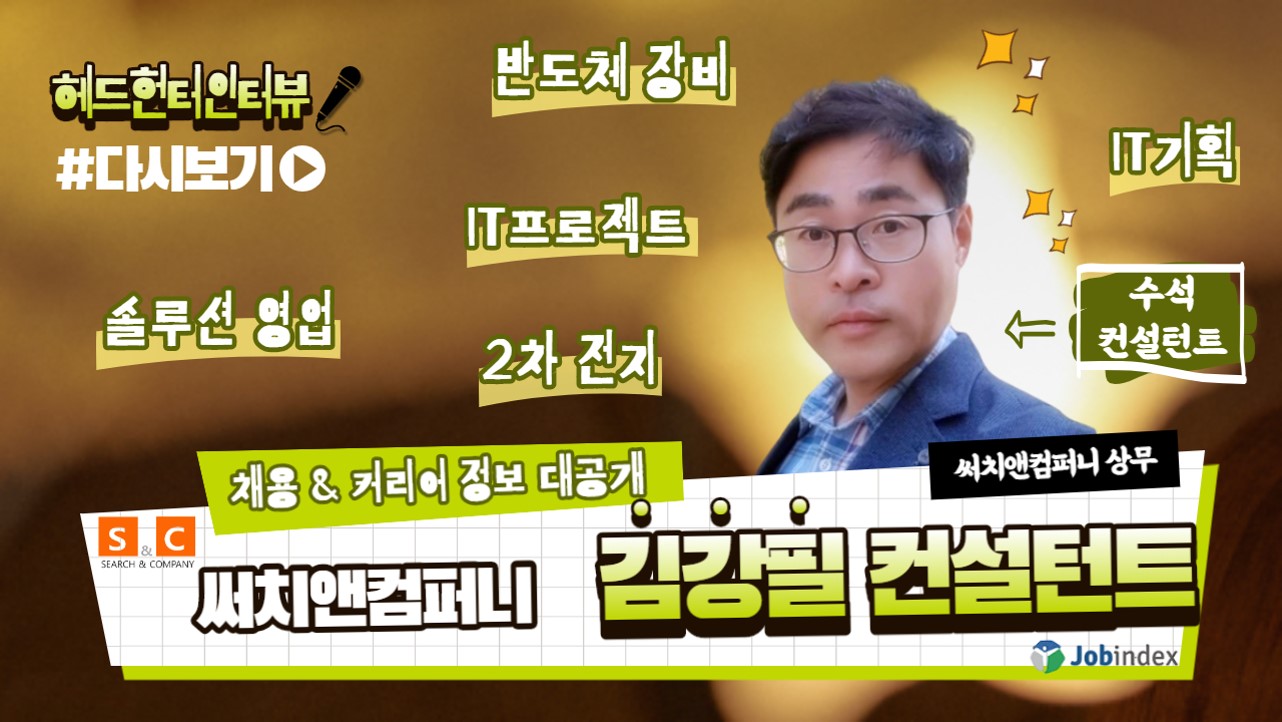 써치앤컴퍼니 김강필 상무님은 현재 IT프로젝트, 반도체 장비업체, 2차전지 및 전자기기 제조사 등을 위주로 프로젝트 진행 중에 있으십니다. 직무는 대부분 제조사 영업, IT기획, 마케팅 등의 포지션을 많이 담당하셨죠!