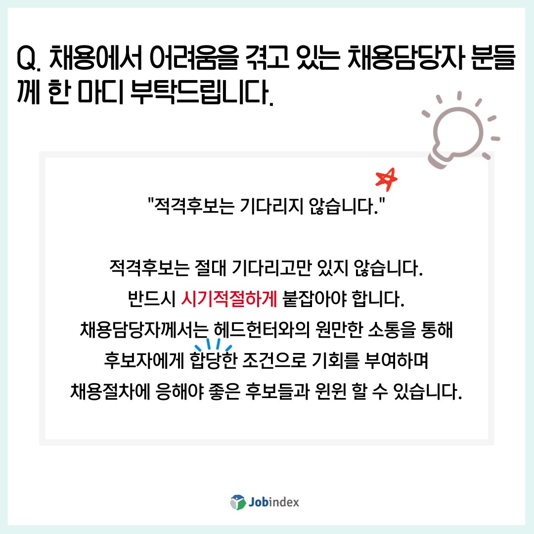 반드시 시기적절하게 붙잡아야 합니다. 채용담당자께서는 헤드헌터와의 원만한 소통을 통해 후보자에게 합당한 조건으로 기회를 부여하며 채용절차에 응해야 좋은 후보들과 윈윈할 수 있습니다.