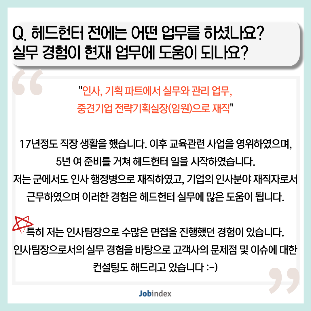 Q. 헤드헌터 전에는 어떤 업무를 하셨나요? 실무 경험이 현재 업무에 도움이 되나요?