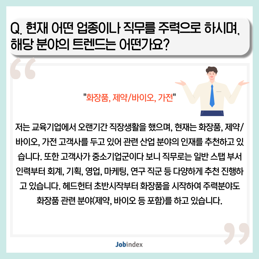 저는 교육기업에서 오랜기간 직장생활을 했으며, 현재는 화장품, 제약/바이오, 가전 고객사를 두고 있어 관련 산업 분야의 인재를 추천하고 있습니다. 또한 고객사가 중소기업군이다 보니 직무로는 일반 스탭 부서 인력부터 회계, 기획, 영업, 마케팅, 연구 직군 등 다양하게 추천 진행하고 있습니다.