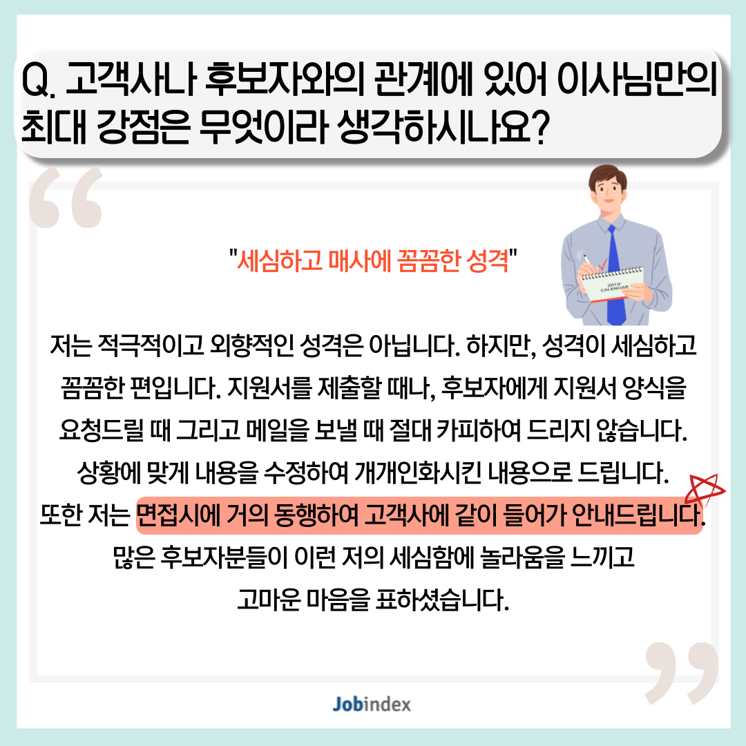 또한 저는 면접시에 거의 동행하여 고객사에 같이 들어가 안내드립니다. 많은 후보자분들이 이런 저의 세심함에 놀라움을 느끼고 고마운 마음을 표하셨습니다.