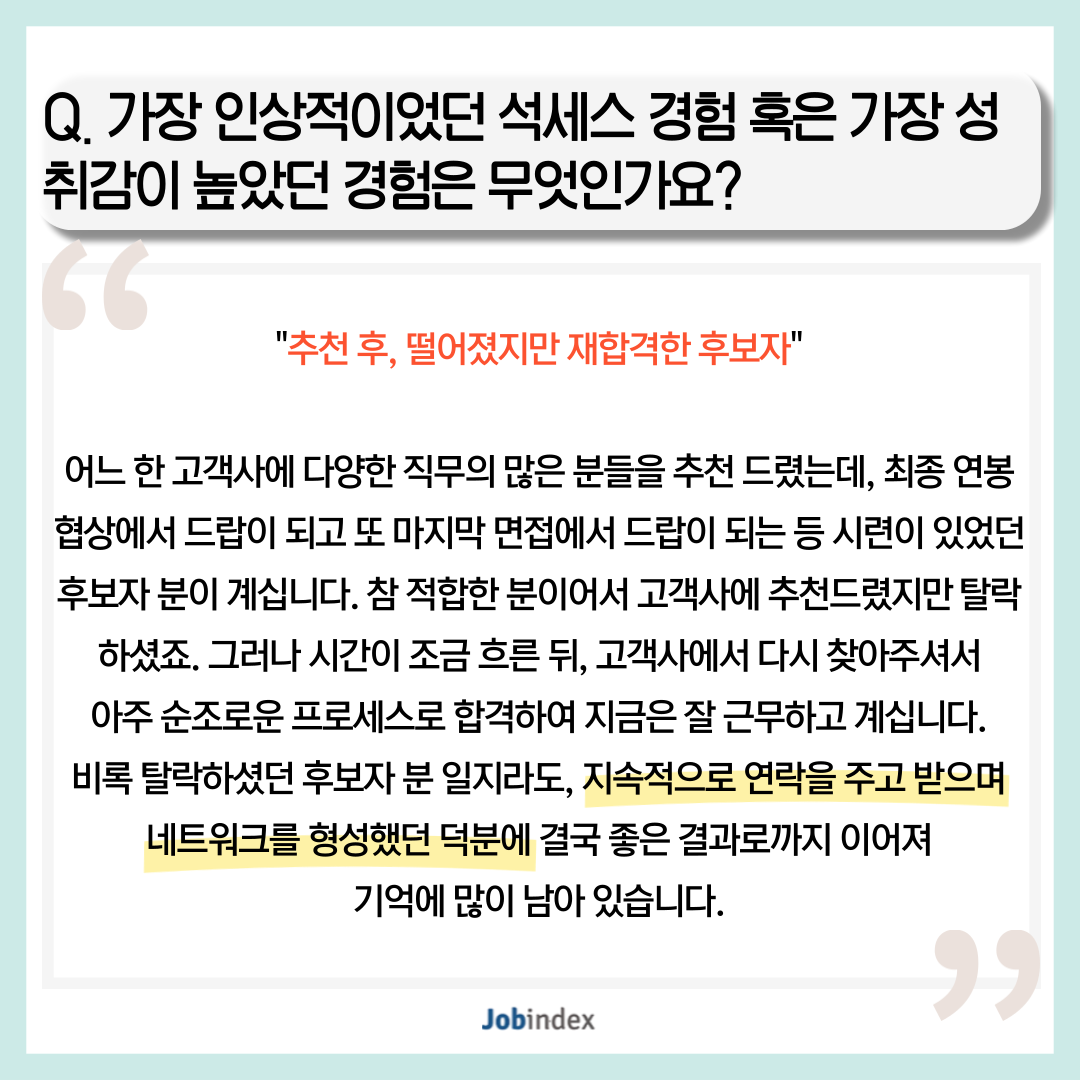 어느 한 고객사에 다양한 직무의 많은 분들을 추천 드렸는데, 최종 연봉 협상에서 드랍이 되고 또 마지막 면접에서 드랍이 되는 등 시련이 있었던 후보자 분이 계십니다. 참 적합한 분이어서 고객사에 추천드렸지만 탈락하셨죠. 그러나 시간이 조금 흐른 뒤, 고객사에서 다시 찾아주셔서 아주 순조로운 프로세스로 합격하여 지금은 잘 근무하고 계십니다.