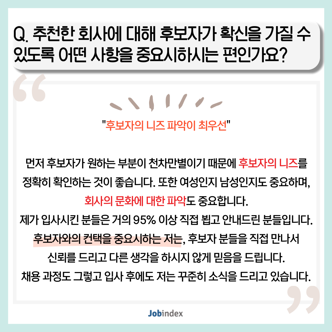Q. 추천한 회사에 대해 후보자가 확신을 가질 수 있도록 어떤 사항을 중요시하시는 편인가요?