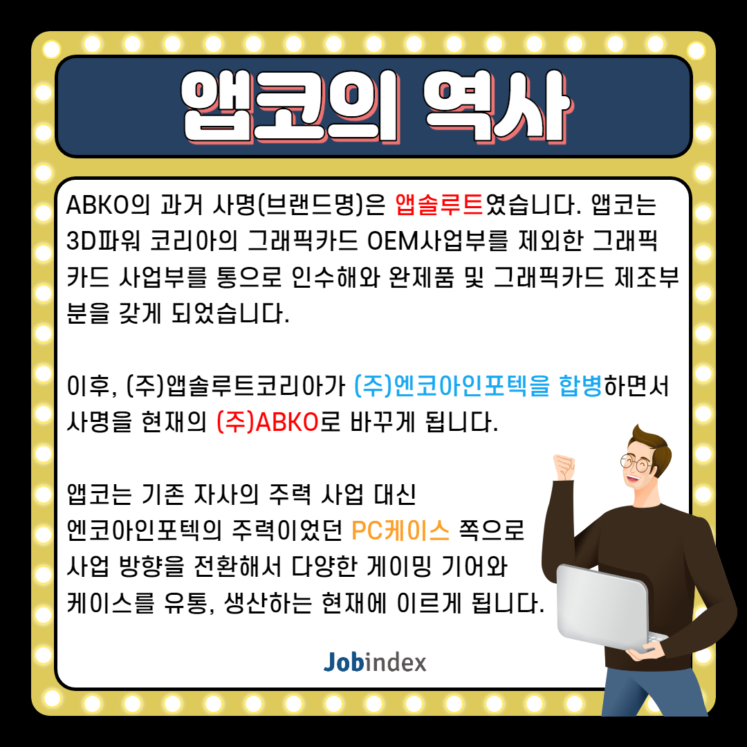 A. ABKO의 과거 사명(브랜드명)은 앱솔루트였습니다. 앱코는 3D파워 코리아의 그래픽카드 OEM사업부를 제외한 그래픽카드 사업부를 통으로 인수해와 완제품 및 그래픽카드 제조부분을 갖게 되었습니다.