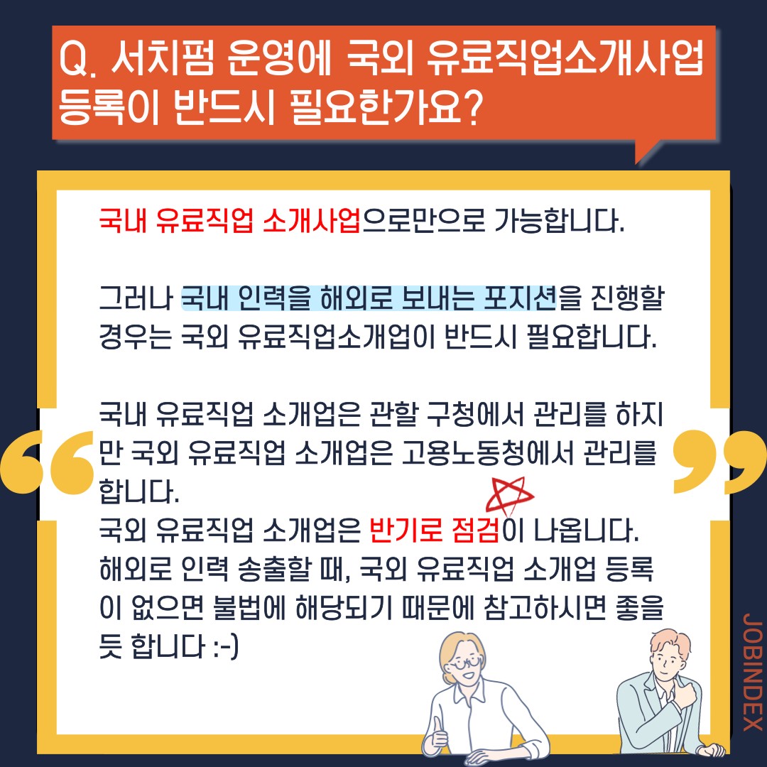 국외 유료직업 소개업은 반기로 점검이 나옵니다. 해외로 인력 송출할 때, 국외 유료직업 소개업 등록이 없으면 불법에 해당되기 때문에 참고하시면 좋을 듯 합니다 :-)