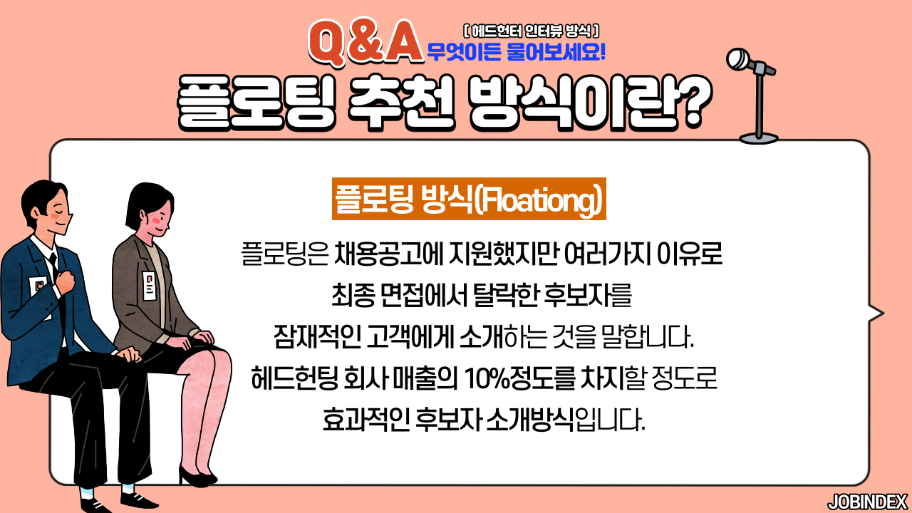 플로팅은 채용공고에 지원했지만 여러가지 이유로 최종 면접에서 탈락한 후보자를 잠재적인 고객에게 소개하는 것을 말합니다. 헤드헌팅 회사 매출의 10%정도를 차지할 정도로 효과적인 후보자 소개방식이라고 하니 참고해보시면 좋을 것 같습니다.
