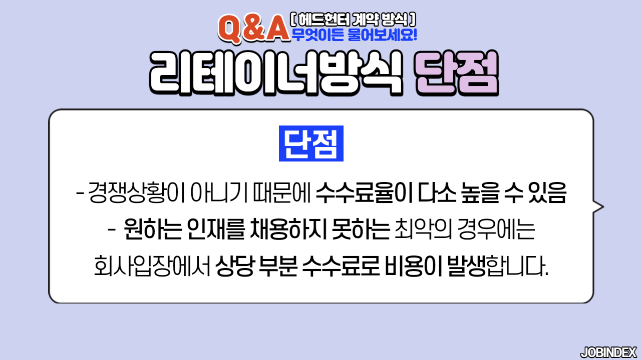 리테이너방식은 주로 임원급(CEO, 임원, 부장급 핵심인력)들을 은밀하게 영입하거나 신규사업을 위해 아주 중요한 자리를 채울 때 주로 이용되는 방식입니다. 수수료율은 25% ~40%까지 그 포지션의 중요도에 따라 달라지게 됩니다. 또한 이 금액은 계약금, 중도금, 잔금등의 형태로 수수료가 분할 지급되기도 합니다.