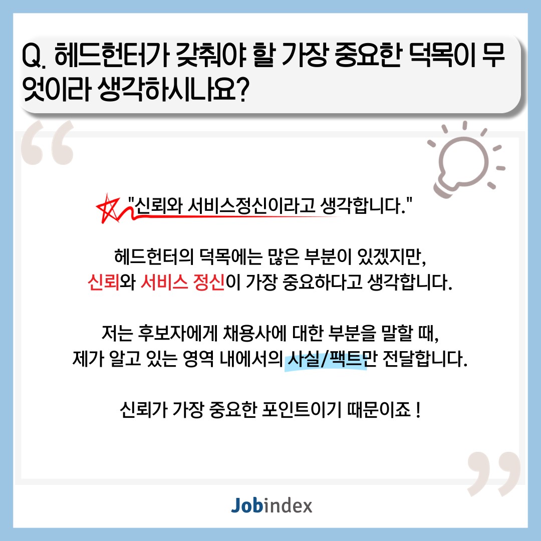 Q. 헤드헌터가 갖춰야 할 가장 중요한 덕목이 무엇이라 생각하시나요?