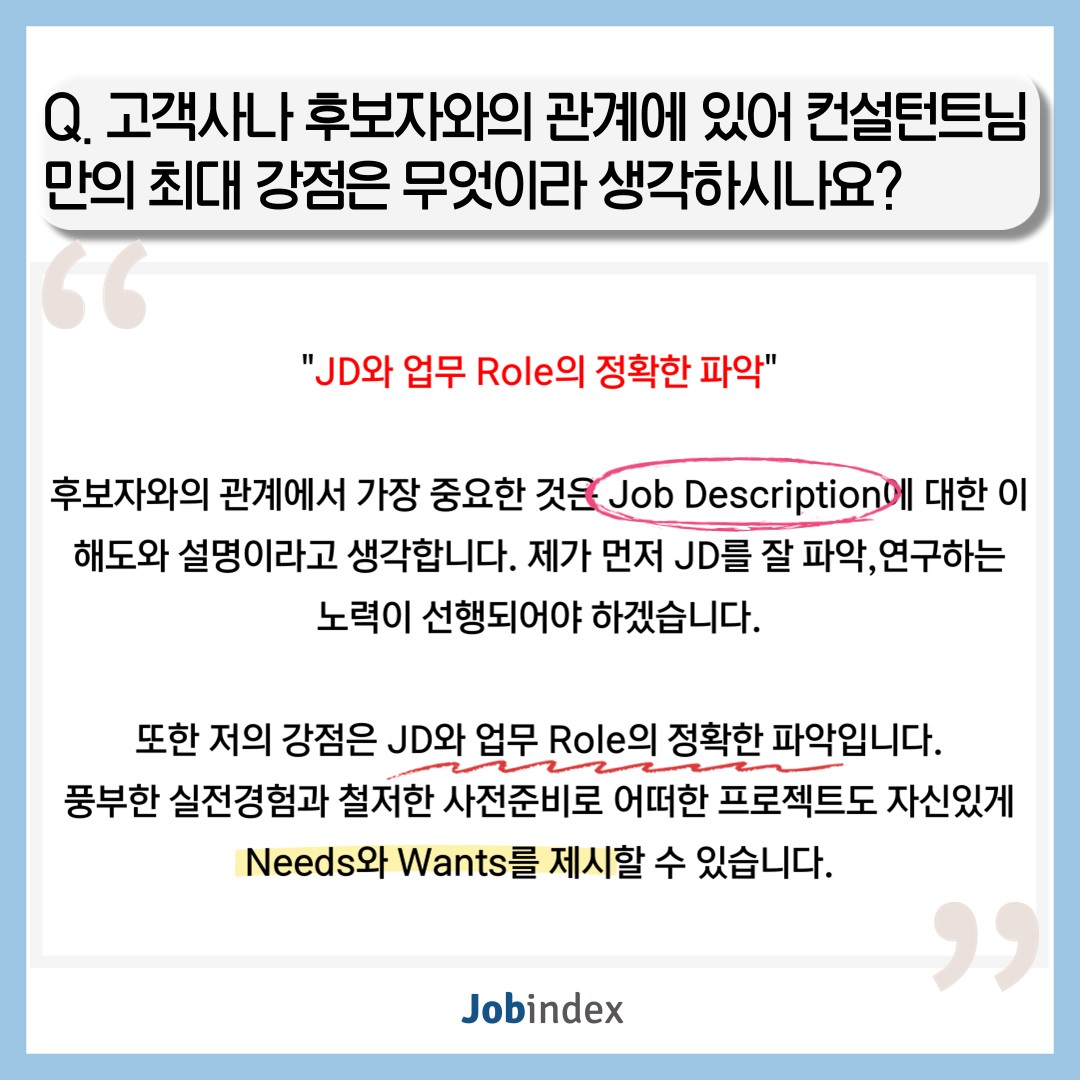 후보자와의 관계에서 가장 중요한 것은 Job Description에 대한 이해도와 설명이라고 생각합니다. 제가 먼저 JD를 잘 파악,연구하는