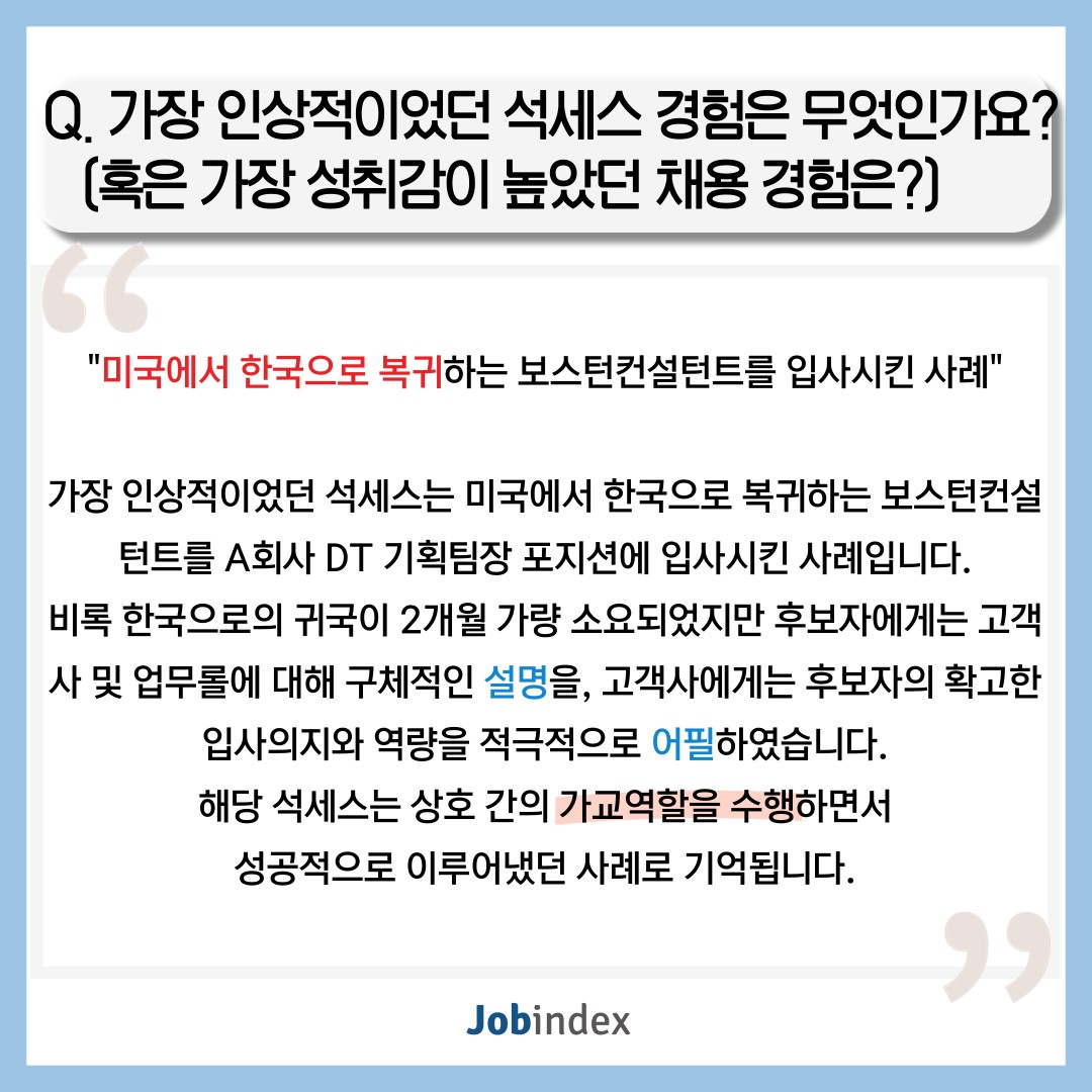 가장 인상적이었던 석세스는 미국에서 한국으로 복귀하는 보스턴컨설턴트를 A회사 DT 기획팀장 포지션에 입사시킨 사례입니다.