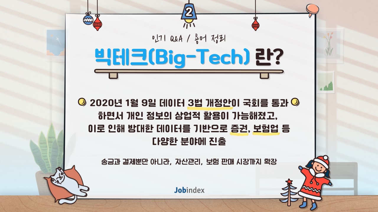 2020년 1월 9일 데이터 3법(개인정보보호법, 신용정보법, 정보통신망법) 개정안이 국회를 통과하면서 개인 정보의 상업적 활용이 가능해졌고, 이로 인하여 방대한 데이터를 보유한 빅테크 등장이 본격화하며 방대한 데이터를 기반으로 증권, 보험업 등 다양한 분야에 진출하였습니다.