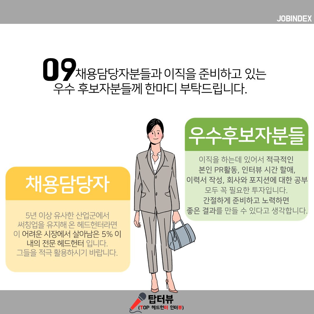 또한 후보자와 고객사에는 신뢰감을 심어 주는 것이, 오래 일하는 평범하면서도 가장 중요한 덕목이라고 생각합니다.