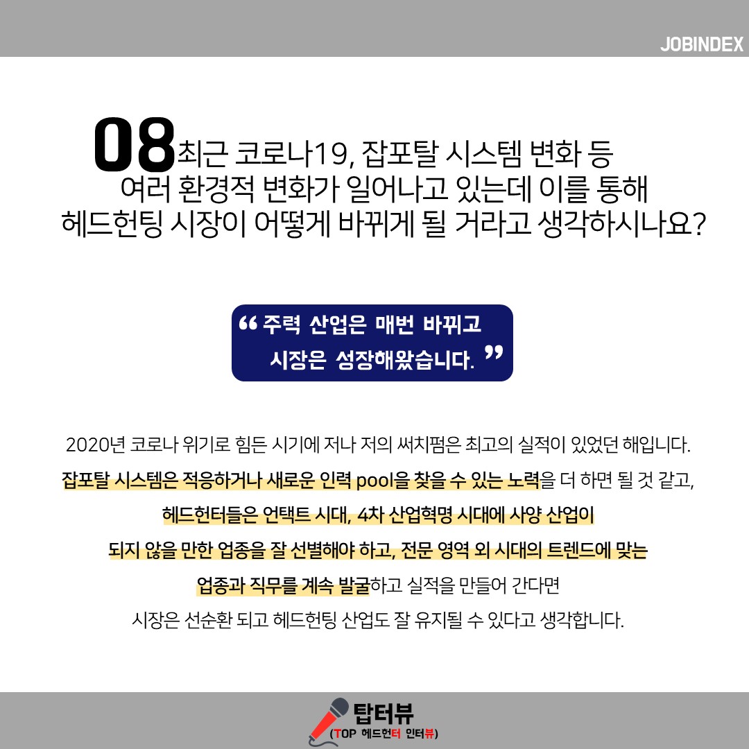 Q. 최근 코로나19, 잡포탈 시스템 변화 등 여러 환경적 변화가 일어나고 있는데 이를 통해 헤드헌팅 시장이 어떻게 바뀌게 될 거라고 생각하시나요?