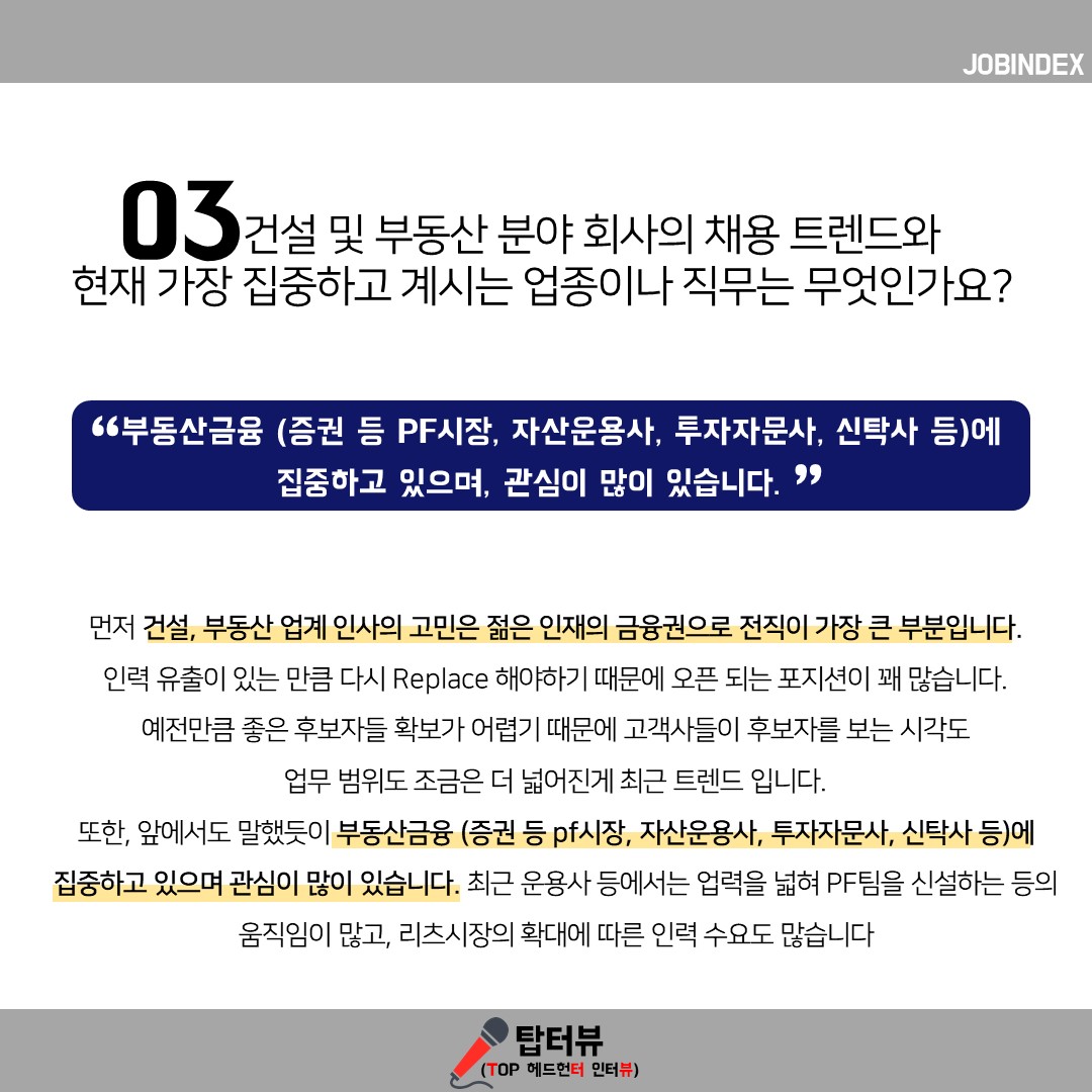 A. 먼저 건설, 부동산 업계 인사의 고민은 젊은 인재의 금융권으로의 전직이 가장 큰 부분입니다. 인력 유출이 있는 만큼 다시 Replace 해야하기 때문에 오픈되는 포지션이 꽤 많습니다. 예전만큼 좋은 후보자들 확보가 어렵기 때문에 고객사들이 후보자를 보는 시각도 업무 범위도 조금은 더 넓어진게 최근 트렌드 입니다.