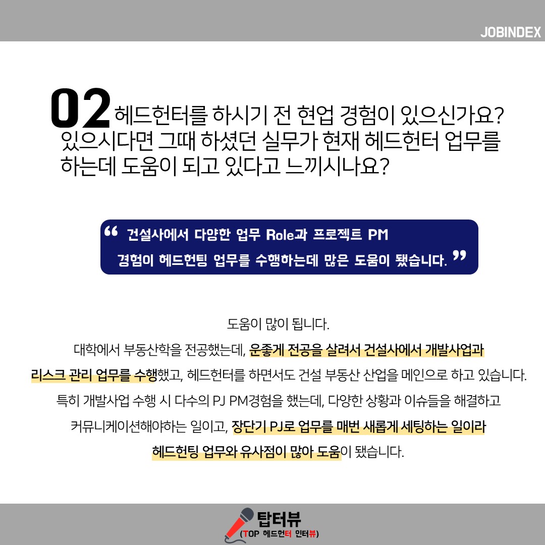 Q. 헤드헌터를 하시기 전 현업 경험이 있으신가요? 있으시다면 그때 하셨던 실무가 현재 헤드헌터 업무를 하는데 도움이 되고 있다고 느끼시나요?