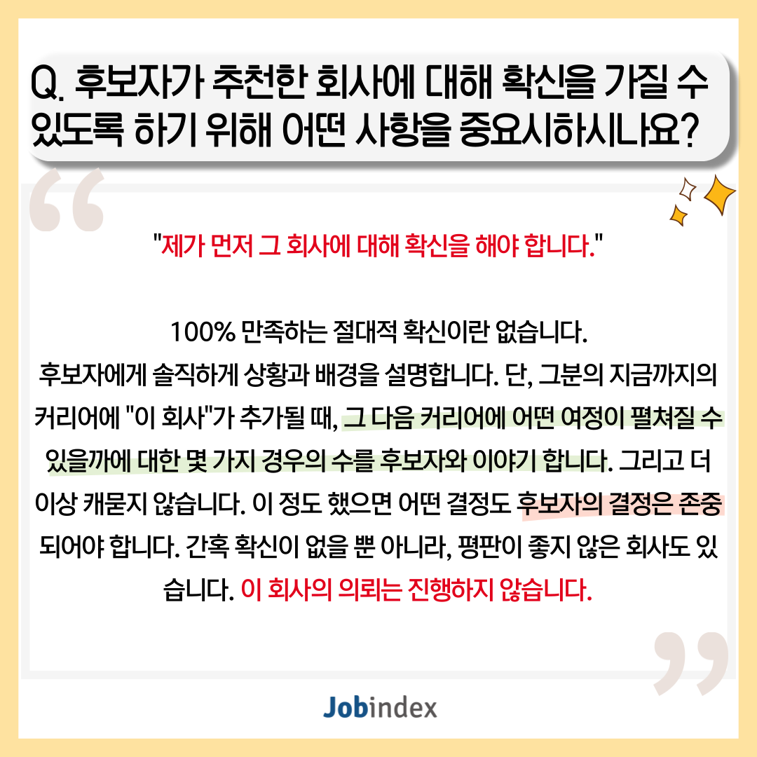 Q. 후보자가 추천한 회사에 대해 확신을 가질 수 있도록 하기 위해 어떤 사항을 중요시하시나요?