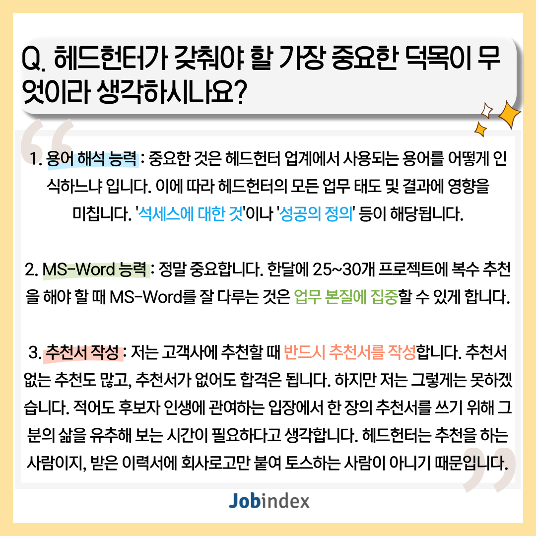 Q. 헤드헌터가 갖춰야 할 가장 중요한 덕목이 무엇이라 생각하시나요?