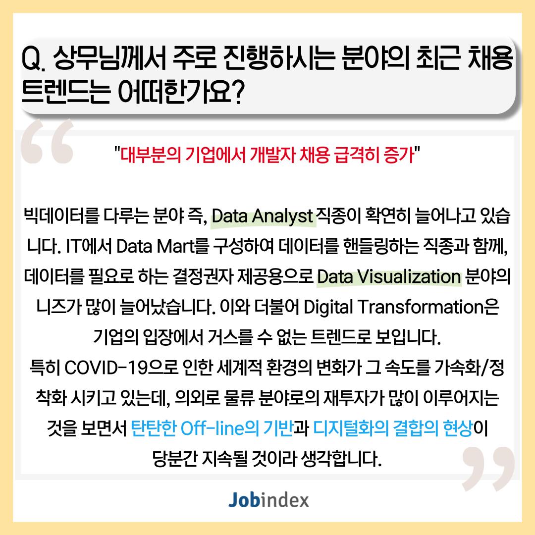 Q. 상무님께서 주로 진행하시는 분야의 최근 채용 트렌드는 어떠한가요?
