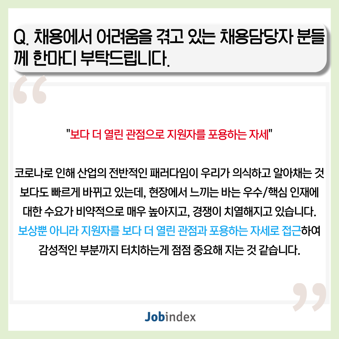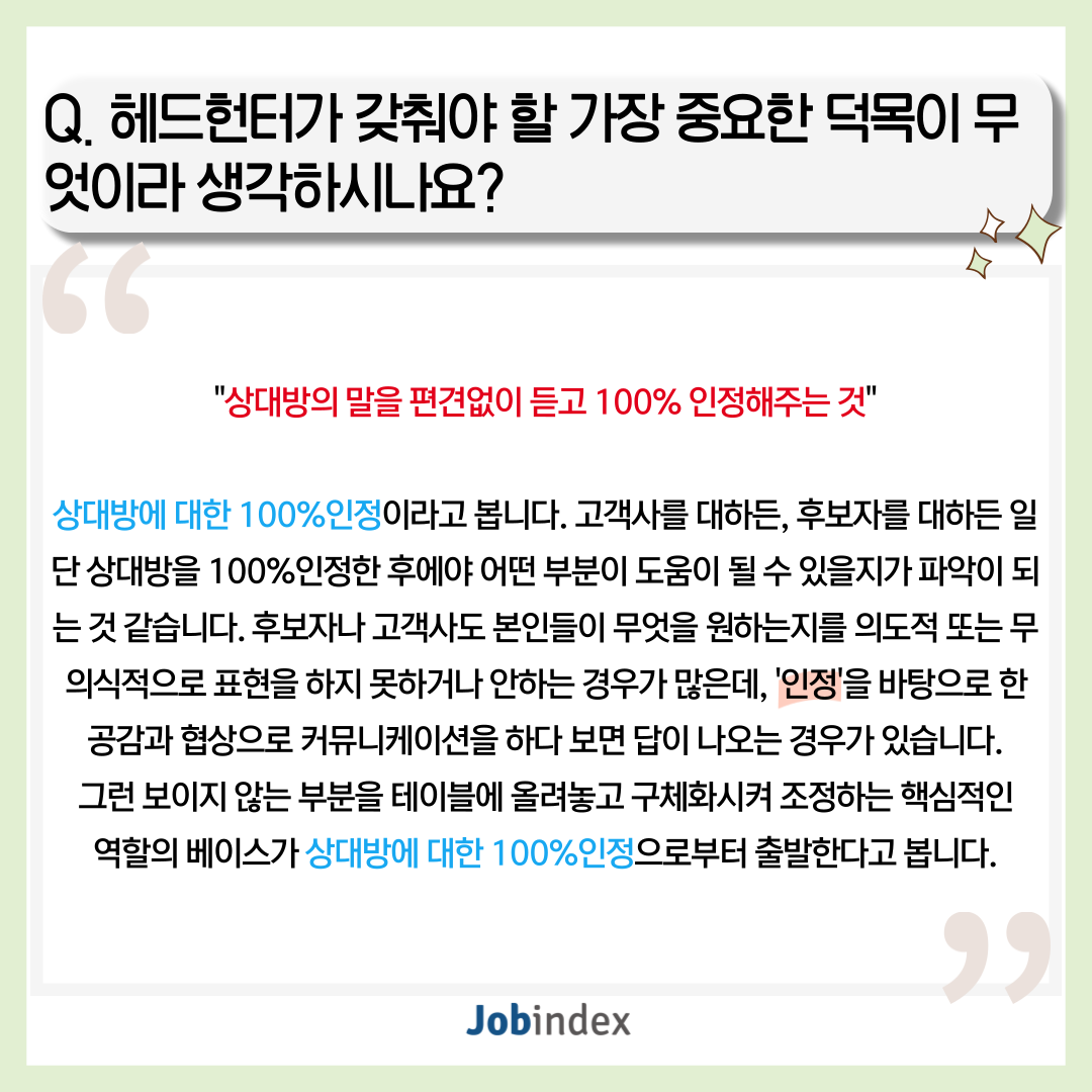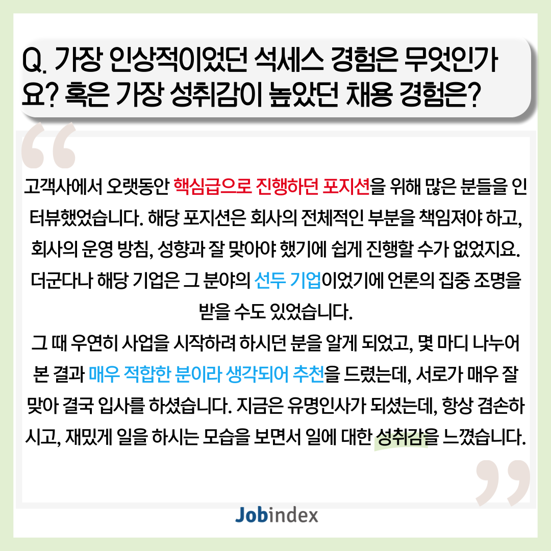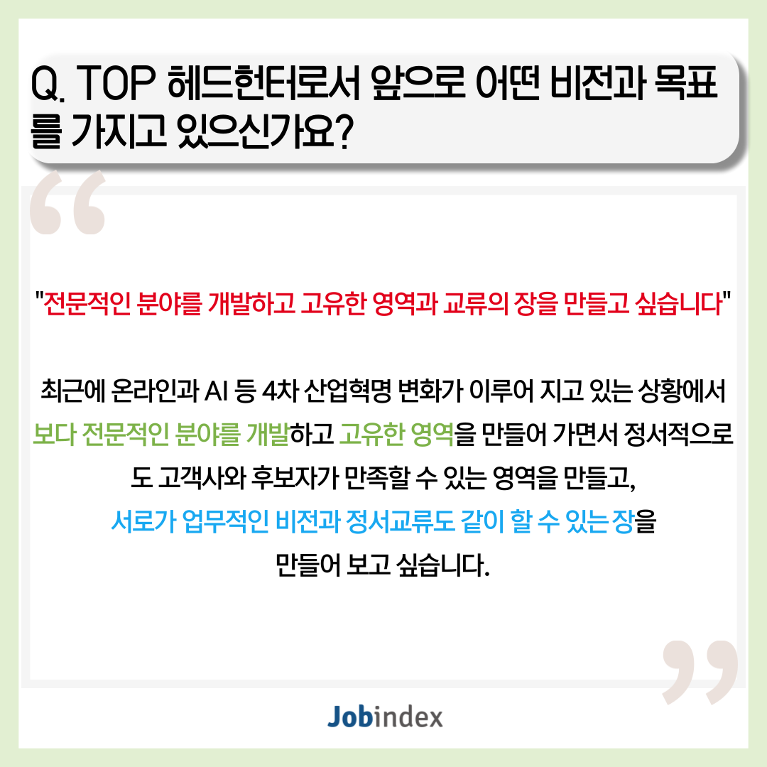 또한 빠른 성장에 따라 핵심인재의 수요가 급증한 스타트업, 유니콘 기업의 채용을 진행하고 계시며, K-컬처 분야도 모두 아우르고 계십니다.