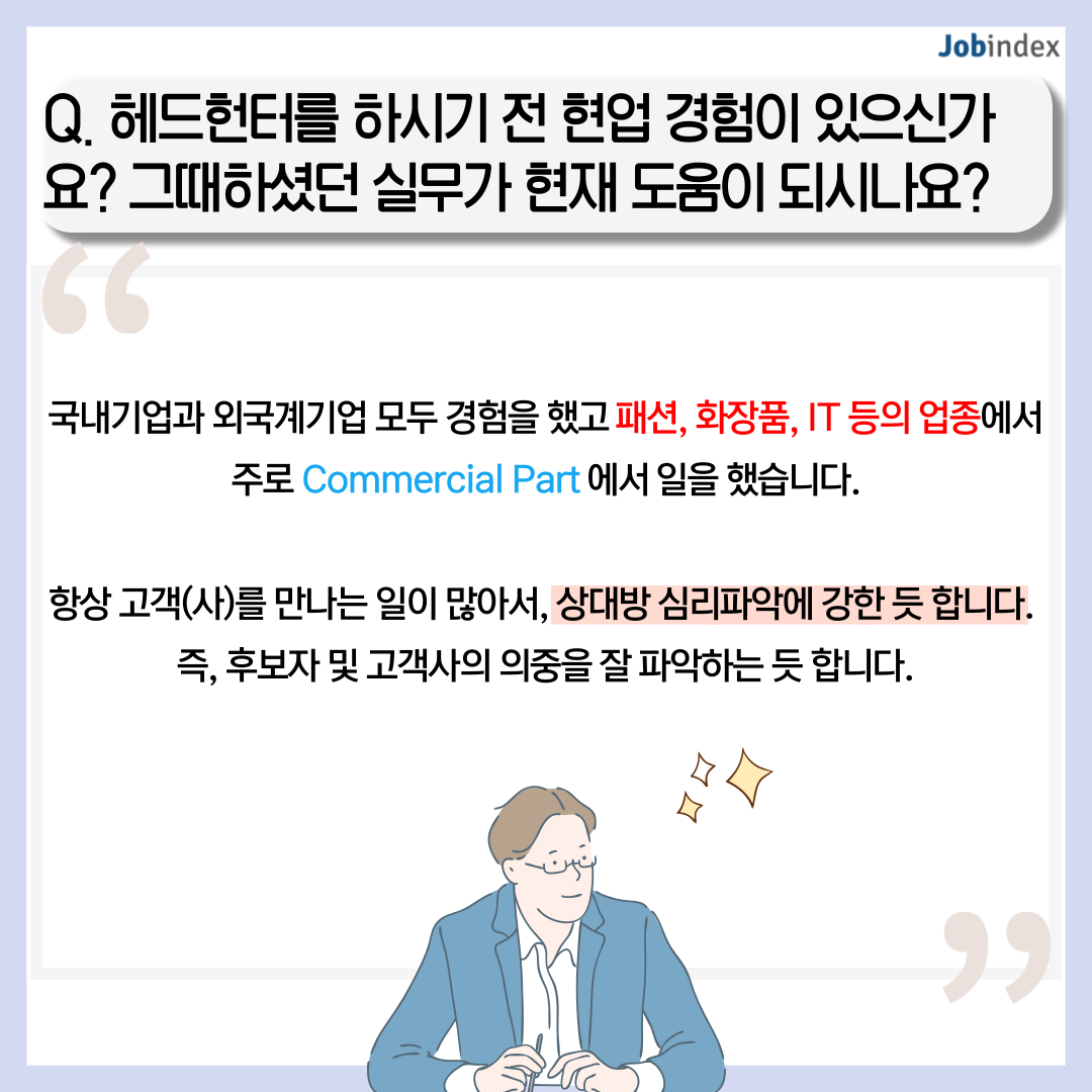 헤드헌터를 하시기 전, 현업에서 주로 Commercial Part에서 근무했던 경험 덕분에 상대방 심리 파악에 강하시고 커뮤니케이션 능력이 뛰어나십니다. 이를 바탕으로, 서치펌의 대표로서, 소속 컨설턴트분들의 고민과 어려움을 해결해주시고, 직접 업무에 투입하여 도움을 주십니다.