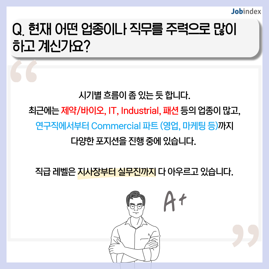 엑스다임 김경진 대표님은 현재 제약/바이오, IT, Industrial, 패션 등의 프로젝트를 진행하십니다. 직무는 연구직에서부터 Commercial파트(영업, 마케팅 등)까지 직급은 지사장부터 실무진까지 다양한 포지션을 진행 중이시죠!