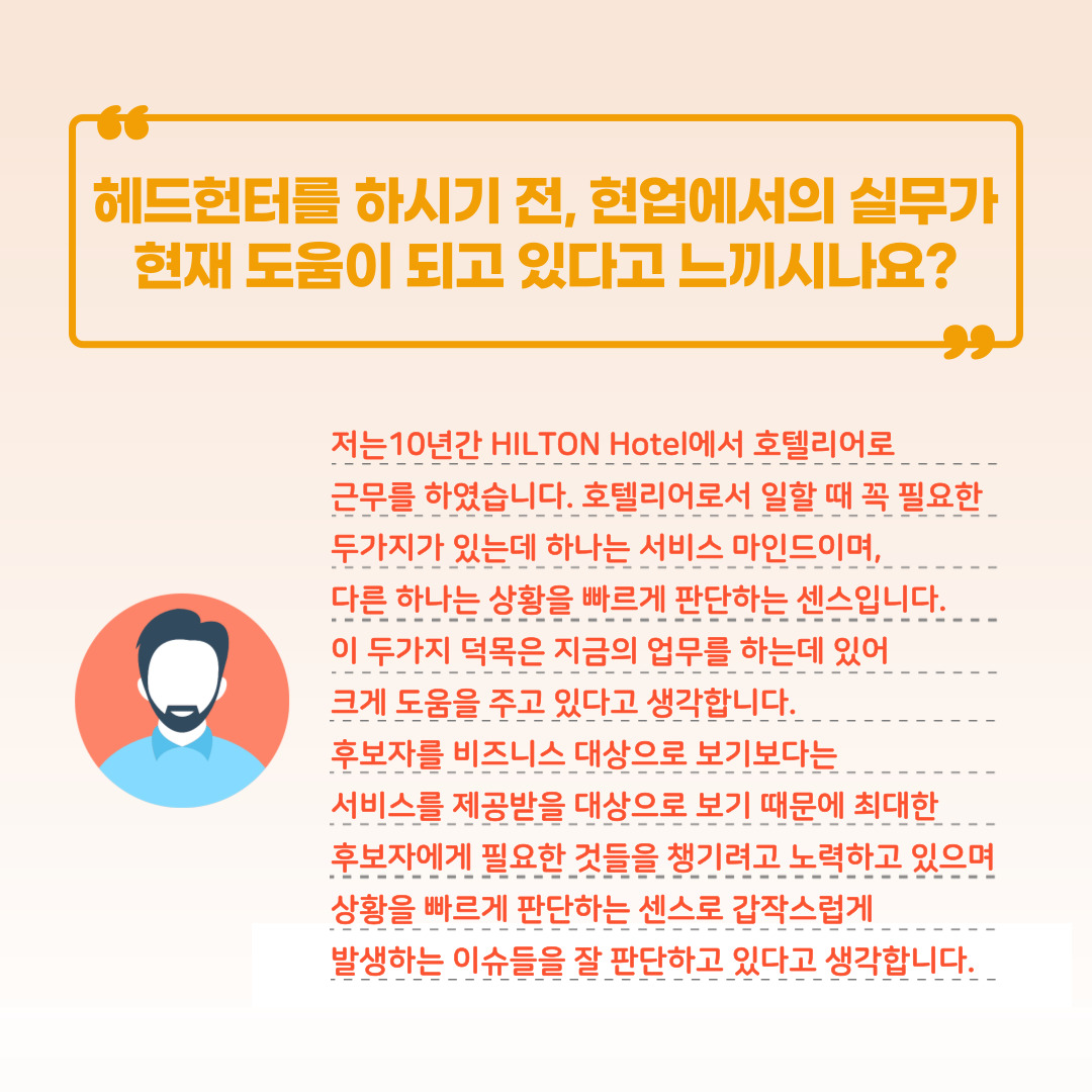 또한, 홍동직 파트너 컨설턴트님은 10년간 HILTON Hotel에서 호텔리어로 근무하셨던 이력이 있으신데요!