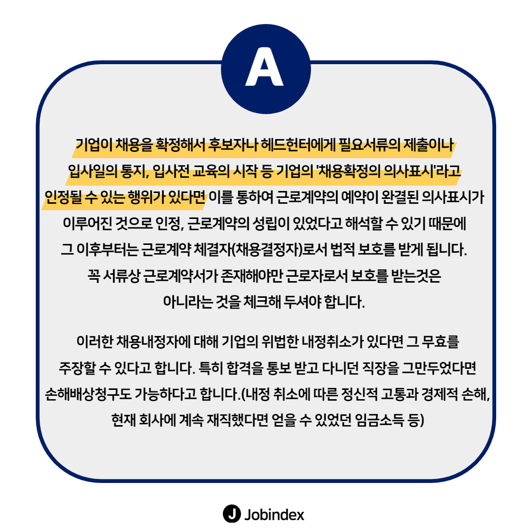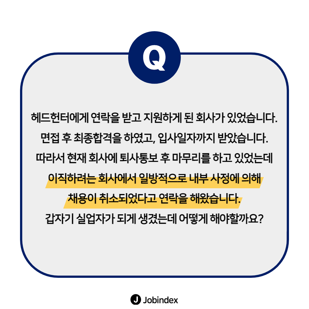 입사 확정 후, 채용을 취소하는 경우? 9,791 1 1 헤드헌팅을 통해 이직을 진행했는데, 입사 확정 후 입사일자까지 받은 상태에서 갑자기 채용이 취소되었다는 연락을 받았을 경우에는 어떻게 해야할까요? ☞ 더 다양한 답변 보러가기 `21.04.05(updated. `21.04.05) 다음글[헤드헌터 인터뷰 콘텐츠] HR맨파워그룹 함성엽 컨설턴트 이전글헤드헌팅을 통한 지원 vs 회사에 직접 지원