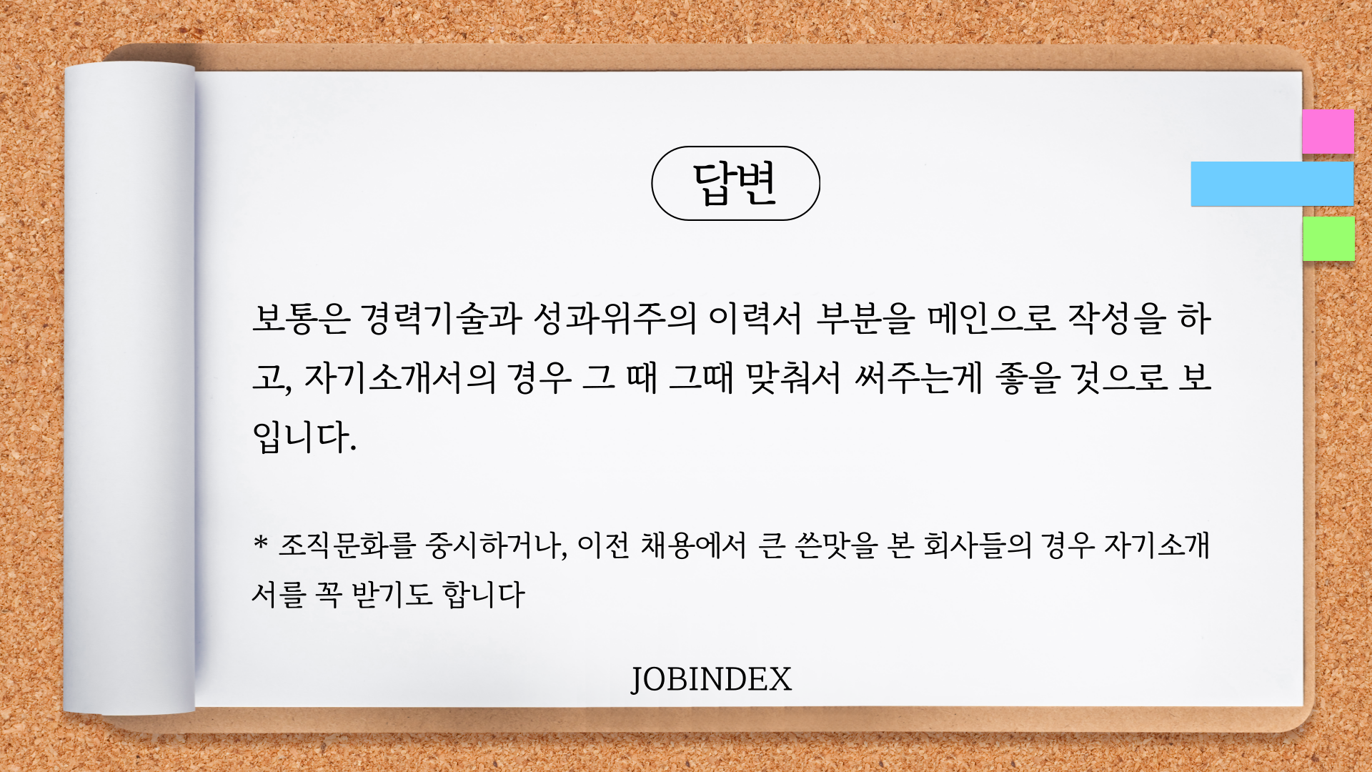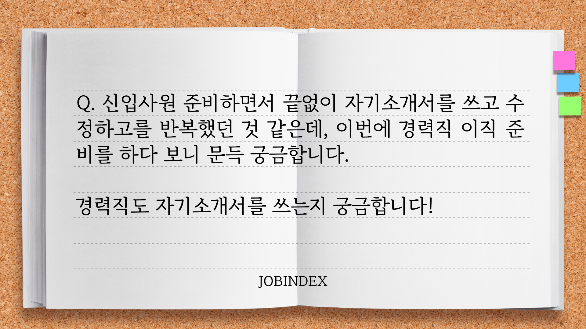 오늘은 잡인덱스 Q&A 게시판에 올라온 질문 중에서 인기 질문이었던 경력직도 자기소개서를 써야하는지에 대해 알아보겠습니다!