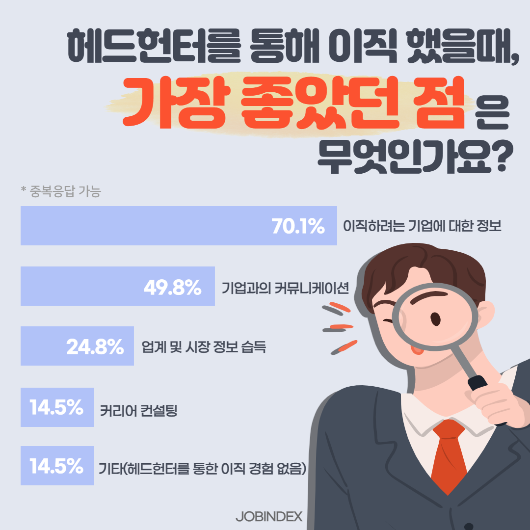 저희 잡인덱스는 정성스럽게 작성해 주신 설문 내용을 토대로 개선된 헤드헌팅 문화로 나아가는데 기여하겠습니다:)