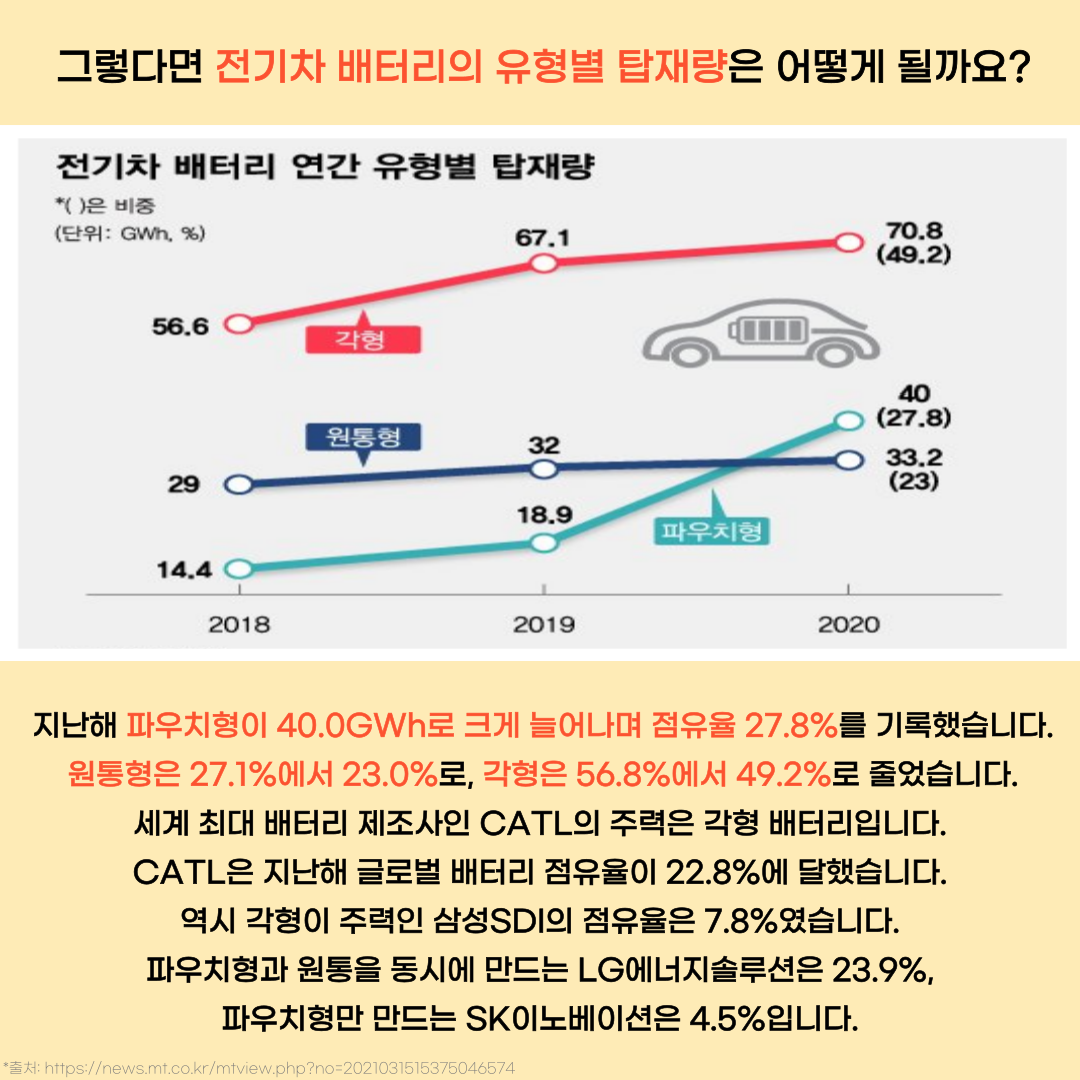 전기차 배터리의 유형과 유형별 탑재량은 어떻게 되나요? 7,237 1 1 전기차 배터리가 다양한 형태로 있다고 하는데, 전기차 배터리의 유형과 유형별 탑재량은 어떻게 되나요? ☞ 전기차 배터리의 종류는? ☞ 전기차 배터리의 유형별 탑재량은? `21.06.29(updated. `21.06.29) 다음글IMC 마케팅 전략이란? 이전글[#3 놓치면 안 될 경력직 채용공고] - '사내 채용 담당자(Recruiter)'모음