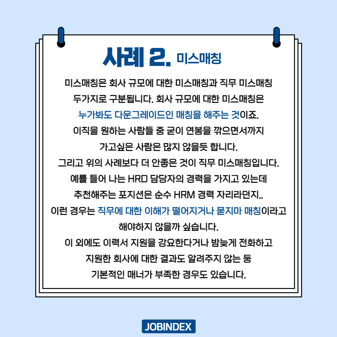 좋지 못한 헤드헌팅 사례들은 어떤 것들이 있을까요? 7,055 1 2 헤드헌팅을 통해 이직을 성공한 분들도 많으시겠지만 이직을 실패하셨거나 좋지 못한 경험을 하신 분들의 이야기가 궁금합니다. ☞ Q&A 보러가기 `21.07.07 다음글국내 증권사 순위가 어떻게 되나요? 이전글[직장생활] 직장인 매너리즘에서 탈출하는 방법