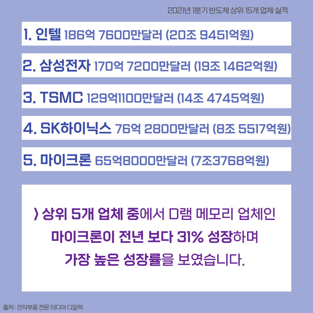 2021년 1분기 반도체 매출 순위는 어떻게 되나요? 6,728 1 1 2021년 1분기 반도체 매출 순위에 대해서 알고 싶습니다! ☞ Q&A 보러가기 경력직 정보는 JOBINDEX `21.07.08 다음글[직장생활] 같이 일하고 싶은 최고의 동료 유형 이전글외국계 증권사 순위가 어떻게 되나요?