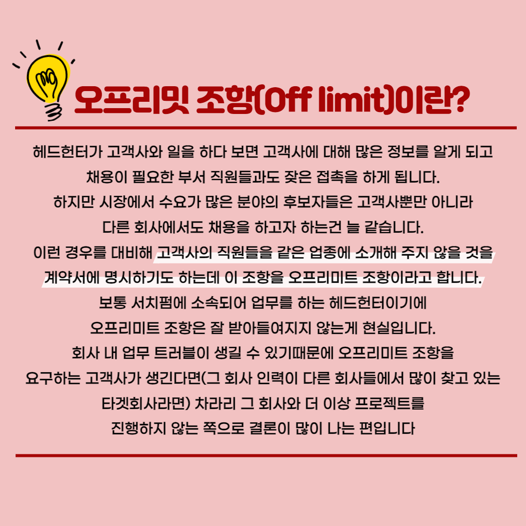 헤드헌팅 계약 시 오프리밋 조항은 무엇을 의미하나요? 6,825 1 1 헤드헌팅 계약 시 오프리밋 조항이 무엇을 의미하나요? ☞ Q&A 보러가기 `21.07.14 다음글[#12 놓치면 안 될 경력직 채용공고] - '프론트엔드 개발자(Front-end)' 모음 이전글차세대 먹거리 기술 푸드테크