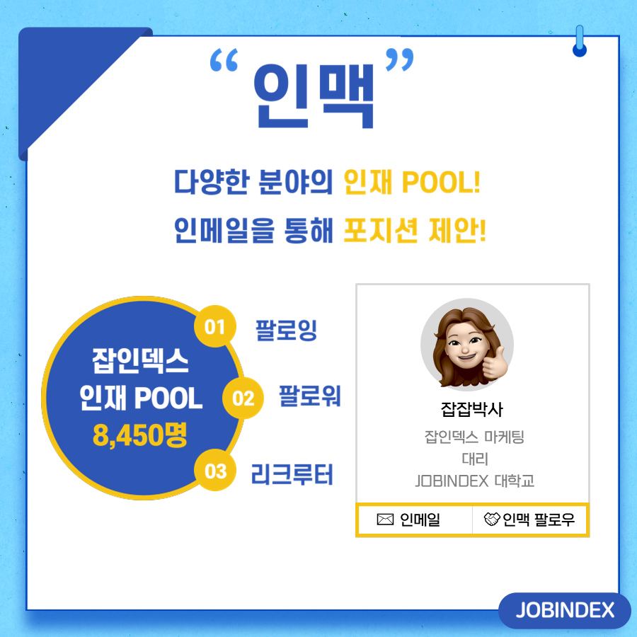 잡인덱스는 약 8,450여명의 인맥 POOL을 보유하고 있습니다. 다양한 분야의 인재를 확인할 수 있으며, 인메일 기능을 통해 포지션 제안이 가능합니다. 그리고 인맥 팔로우를 함으로써 관련 채용 정보를 받아볼 수 있습니다.