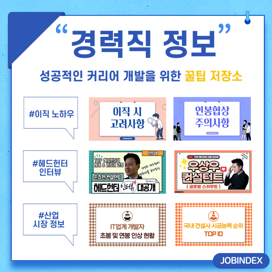 잡인덱스의 경력직 정보는 성공적인 커리어 개발을 위한 유익한 콘텐츠를 볼 수 있는 곳입니다. 이직 노하우, 헤드헌터 인터뷰, 산업 및 시장 정보에 관한 다양한 콘텐츠를 통해 정보를 얻을 수 있습니다.