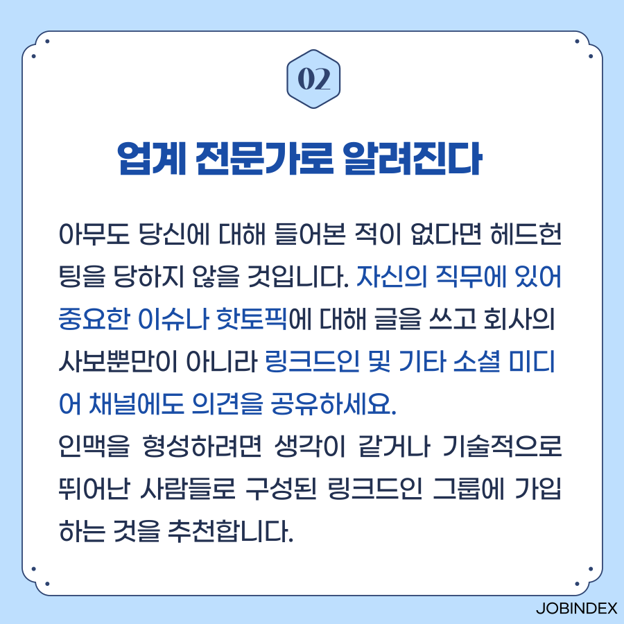 이직을 준비할 때, 헤드헌터를 통해 나의 연차와 능력에 딱 맞는 포지션을 추천받을 수 있습니다. 이렇게 헤드헌터의 도움을 받게 되면 이직이 조금 수월해질 수 있는데요, 그래서 준비한 주제는 '헤드헌팅 받는 6가지 방법'입니다. 다음의 6가지 방법을 잘 활용해서 헤드헌팅 받기를 바랍니다! 😉