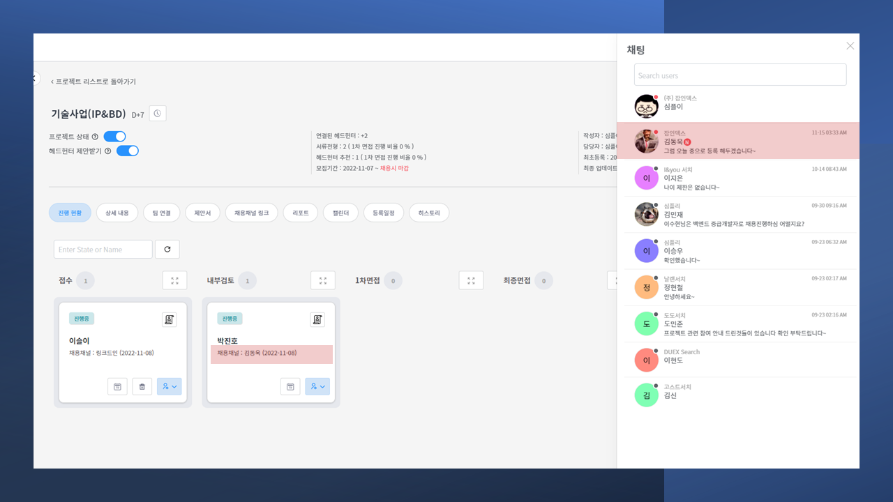 심플리는 보드형태로 채용을 한눈에 파악할 수 있게 해드리며, 채용관련된 분들과 채용프로젝트 채팅을 통해 손쉽게 소통할 수 있습니다.