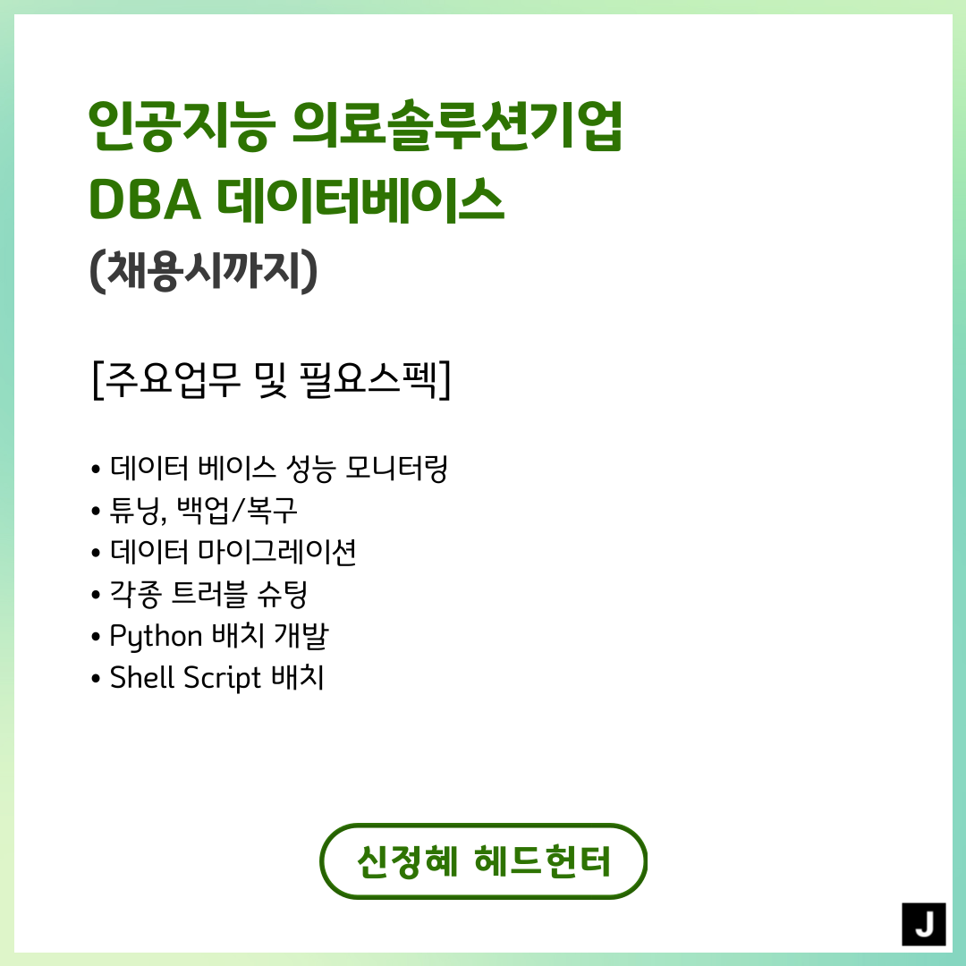 📢 [인공지능 의료솔루션기업] - DBA 데이터베이스 개인정보관리 관리자(채용시까지)