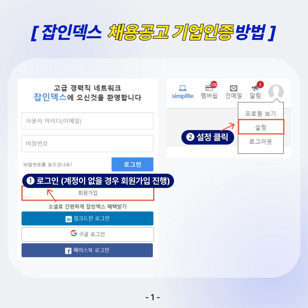 ❶ 잡인덱스 홈페이지 접속 후, 로그인을 해주세요.(*계정이 없을 경우 회원가입 진행)